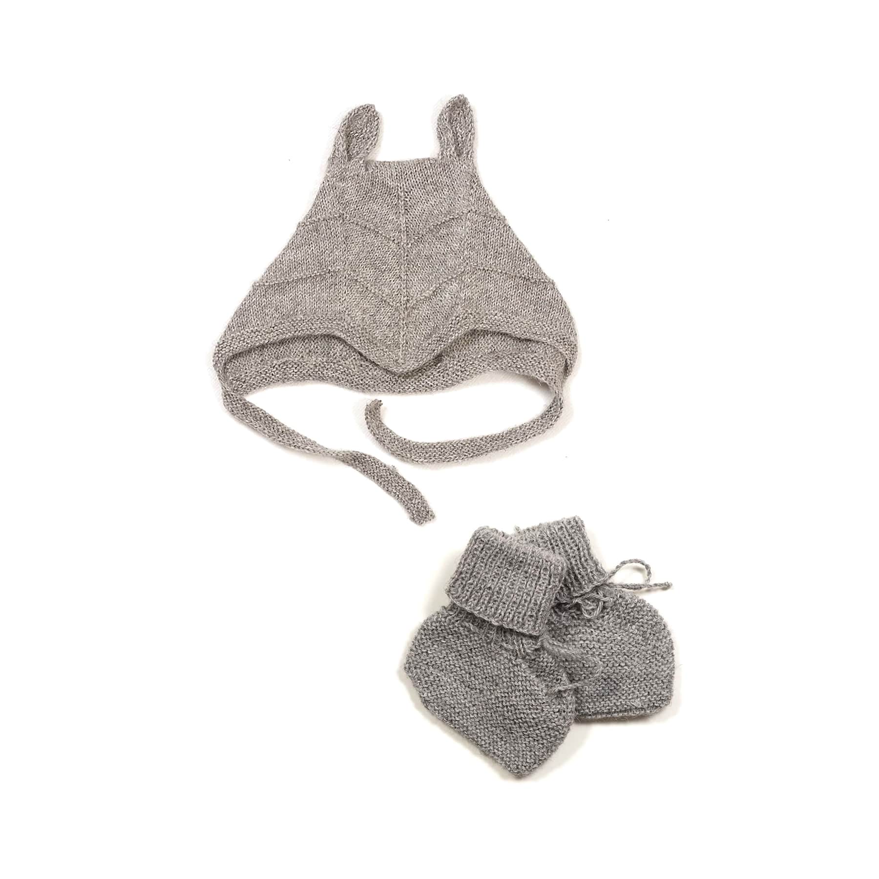 Huttelihut sæt bestående af futter og babyhue med ører. Alpaka uld. Grå.