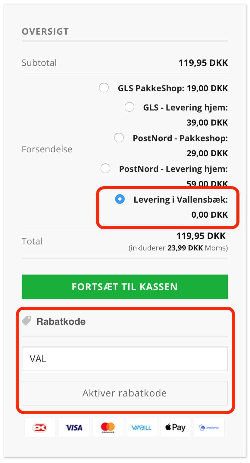 - I rabatkodefeltet skriver du “VAL” og klikker på Aktiver rabatkode. Så trækkes de 15%